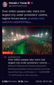 Tramp kanalda yayımlanan süjeti rəsmi sosial şəbəkə hesabında paylaşıb. Prezident İrana qonşu ölkə kanalından paylaşdığı video ilə mitinqdə iştirak edənlərin sayının durmadan artdığını göstərib.