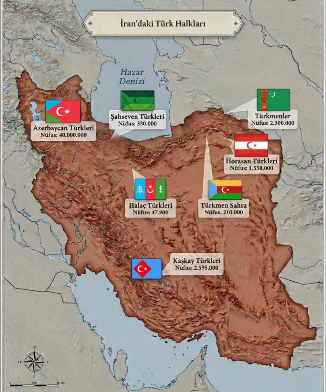 İran ərazisində milyonlarla türk mənşəli əhali müxtəlif bölgələrdə tarixi yurdlarında yaşayır. “İran’dakı Türk Xalqları” adlı xəritədə ölkə üzrə bir neçə böyük türk icmasının adı və təxmini say göstəriciləri yer alıb.