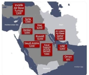 İran parlamentinin Milli Təhlükəsizlik Komitəsinin sədri İbrahim Əzizi Yaxın Şərqdəki ABŞ hərbi bazalarının xəritəsini dərc edib.